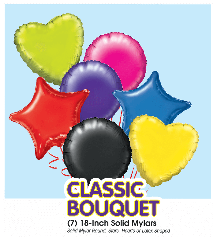 All pricing includes Helium unless otherwise stated. Please make sure to select a time and date for balloon order pickup during checkout. 7 - 18 inch Solid Mylars(Solid Mylar Round, Stars, Hearts, or Latex Shaped)